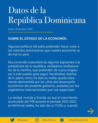 Por medio del comunicado colgado en su red social, Mejía expresa que “la verdad, monda y lironda, es que el crecimiento acumulado del PIB durante el período 2021-2022, en términos reales, ha sido de un 17.2%, y que “cuando descontamos la caída del -6.7 % ocurrida en 2020, todavía nos queda una cifra de 10.5 % de bienestar para los dominicanos”.