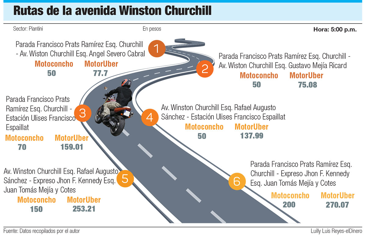 “¿Usted va?”, pregunta un motoconchista a una mujer que pasaba por la acera en la avenida Winston Churchill esquina Francisco Prats Ramírez, que es donde está ubicada la parada “La Unión”. El presidente de esa parada, Wilson Medina, declaró a elDinero que se inició en 2018 cuando se manejaban por la plataforma digital Uber. Cuenta que al ver la alta demanda de los pasajeros que transitaban esta zona, se empezaron a organizar con Fenamoto y el Intrant para formalizar la ruta.