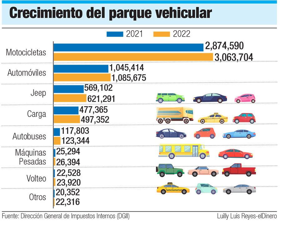 En el 2022, la Dirección General de Impuestos Internos (DGII) registró 5,463,996 unidades de vehículos, 311,548 más que el 2021. De esa cantidad, 3,063,704son motocicletas, es decir, el 56% del total. El 19.9% son automóviles, 11.4% “yipetas” y el 12.7% corresponde a autobuses, vehículos de carga y otros.