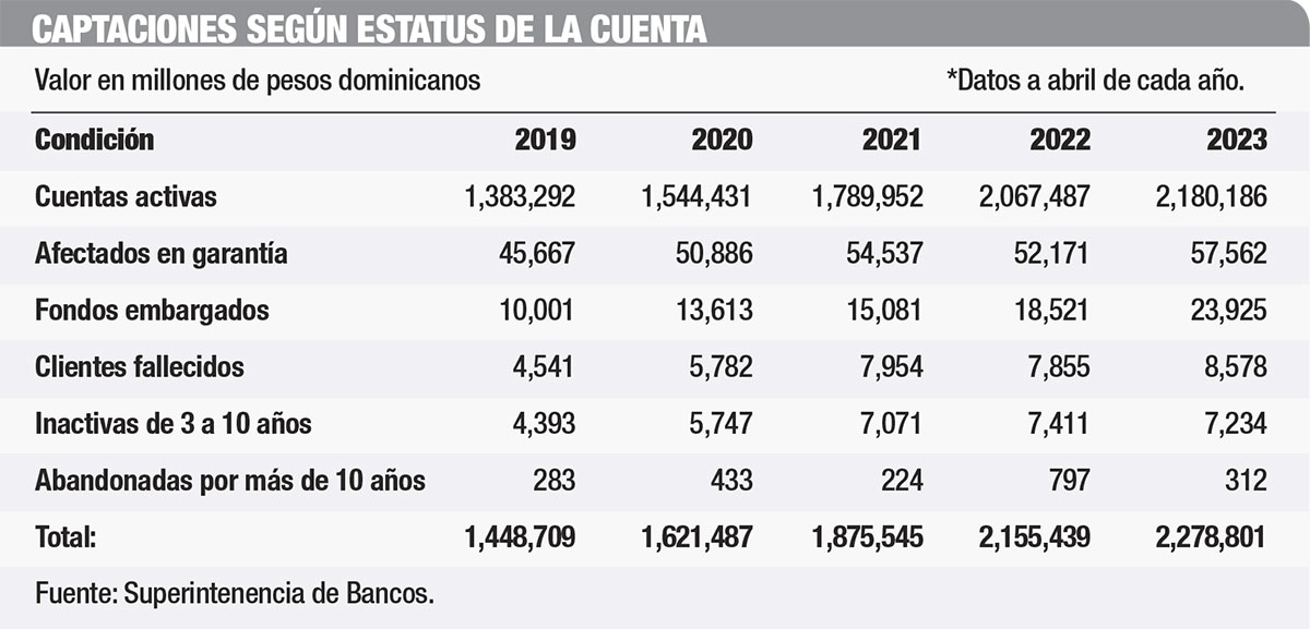 En abril de 2023, las entidades de intermediación financiera (EIF) registraron captaciones en cuentas inactivas de tres a 10 años por un balance de RD$7,234 millones.