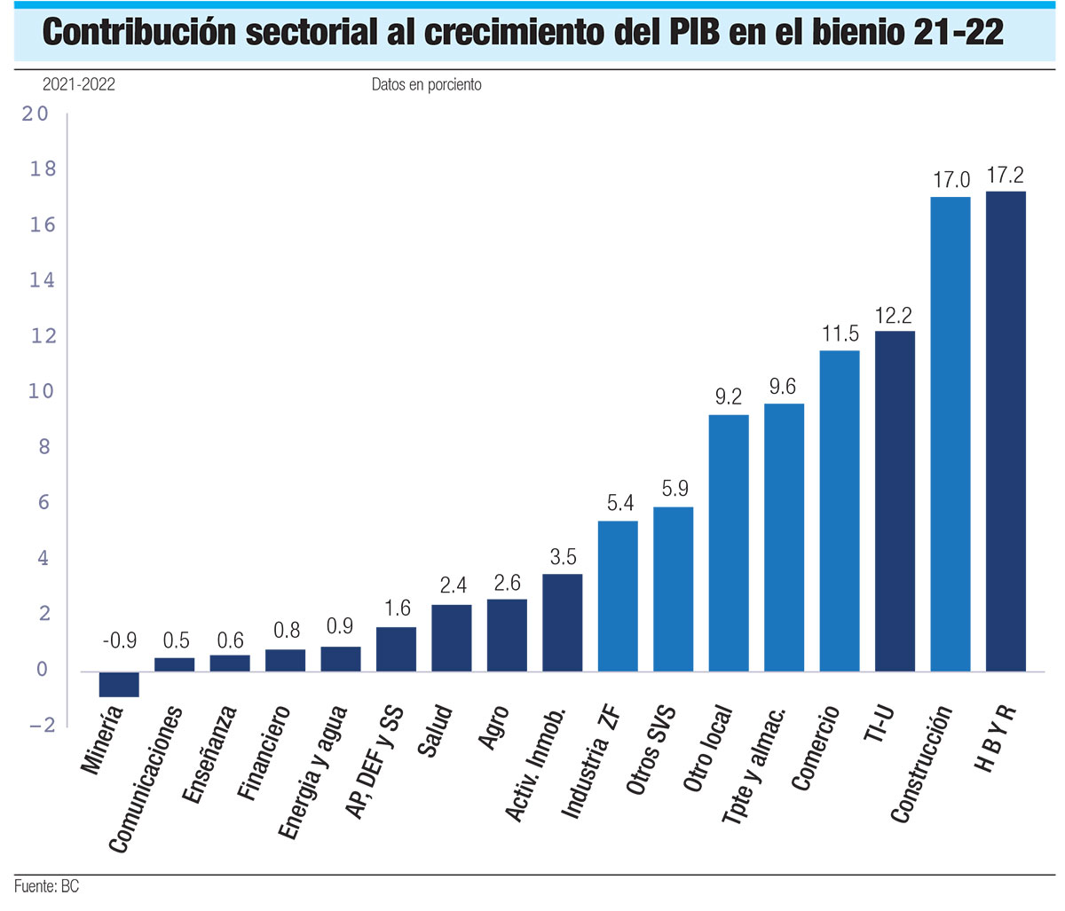 Los sectores zonas francas, manufactura local, comercio, construcción, transporte, almacenamiento y otros servicios contribuyeron en un 58.5% al crecimiento acumulado de la economía dominicana durante el período 2021-2022.