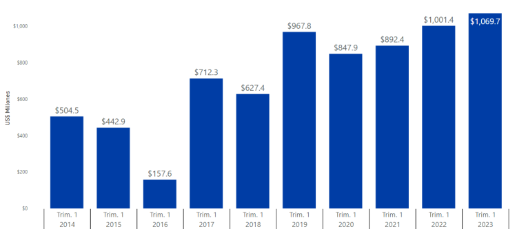 ProDominicana expresa que los flujos de IED recibidos en el primer trimestre de este año 2023 es el más alto de la historia y que por cuarto año consecutivo, se mantiene en crecimiento, representando un comportamiento récord si se compara con los primeros tres meses de años anteriores. De acuerdo con cifras mostradas por el Banco Central de República Dominicana, en el período comprendido entre enero y marzo de 2023, el país alcanzó los US$1,069.7 millones en inversión extranjera, representando un aumento del 7% equivalente a US$68.3 millones adicionales con respecto al mismo período del año anterior.