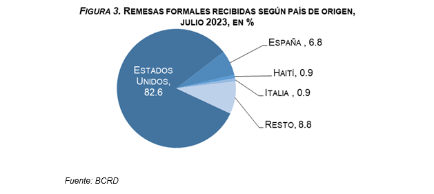 El BCRD destaca también la recepción de remesas por canales formales desde otros países en el mes de julio, como España, por un valor de US$53.9 millones, un 6.8% del total, siendo este el segundo país en cuanto a total de residentes de la diáspora dominicana en el exterior se refiere, así como Haití e Italia, con 0.9% de los flujos recibidos cada uno. El resto de la recepción de remesas se divide entre países como Suiza, Canadá y Panamá, entre otros.