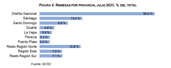 Respecto a la distribución de las remesas recibidas por provincias, el BCRD señala que el Distrito Nacional recibió una proporción del 36.0% durante julio, seguido por las provincias Santiago y Santo Domingo, con un 13.4% y 8.8%, respectivamente. Esto indica que más de la mitad (58.2%) de las remesas se recibe en las zonas metropolitanas del país.