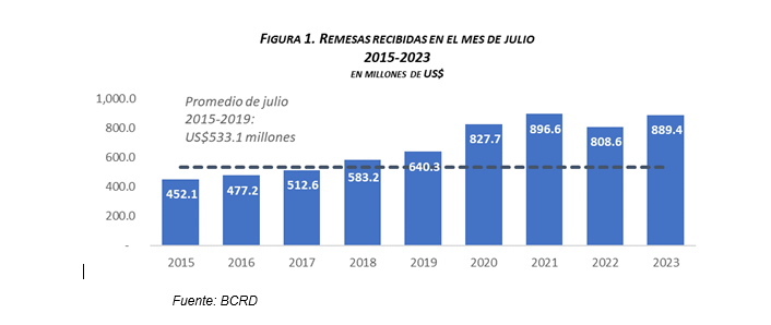 Particularmente, durante el mes de julio se registró un valor de remesas de US$889.4 millones, con un incremento de 5.1% al compararlo con el mes de junio de 2023, y un aumento de 10.0% comparado con julio de 2022. Estos flujos marcan el séptimo mes con incremento consecutivo durante el año, extendiendo el comportamiento observado desde inicios del último trimestre de 2022.