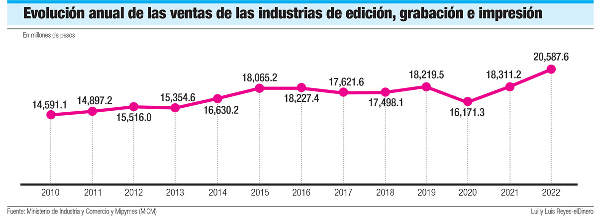 El MICM muestra que la evolución anual de las ventas de edición, grabación e impresión registró un crecimiento interanual de 3.1% en promedio en los últimos 12 años. En 2010, la cifra se ubicó en RD$14,591.1 millones y en 2022 alcanzó los RD$20,587.6 millones. Esta cantidad se traduce en un aumento de un 41%.