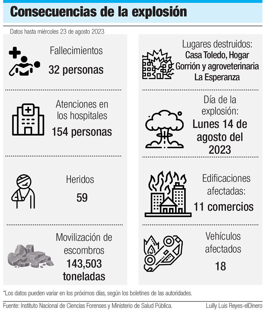 “Hay dos edificios totalmente destruidos, los daños son incalculables tanto los empleados, esposa, hija y suegro del propietario de Casa Toledo fallecieron (…). Los dueños de los negocios que fueron afectados no tengan información de lo estimado, no podremos decir cuál es la pérdida”, explicó.