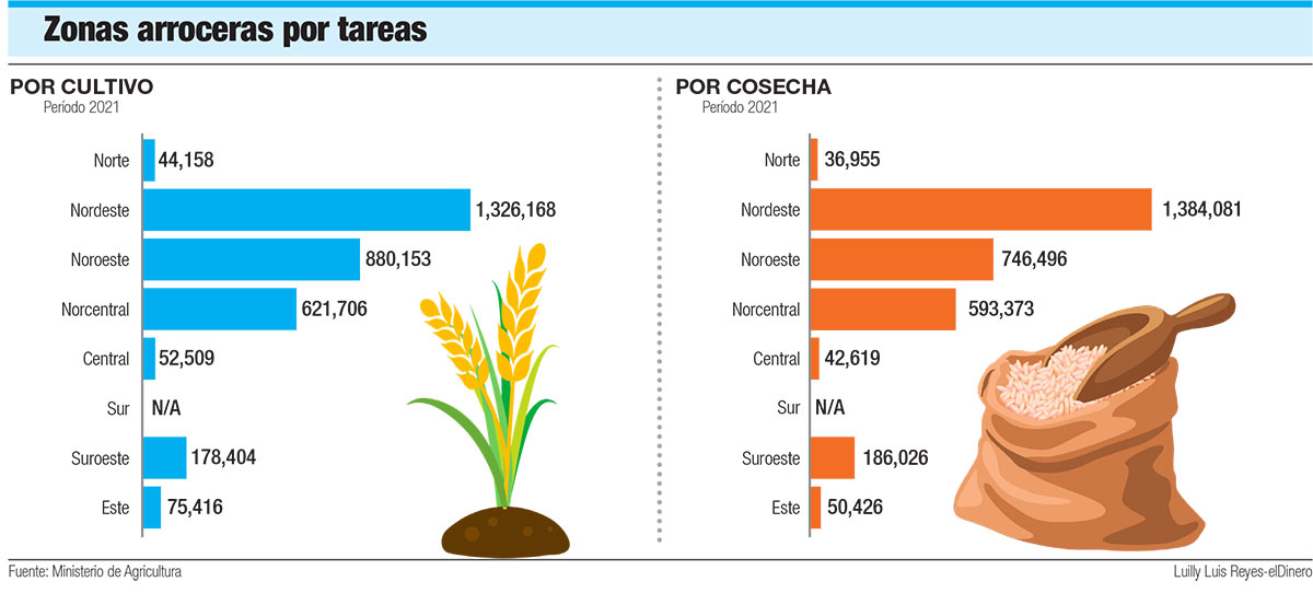 Para 2021 las de mayor porcentaje en la producción de arroz son: La región Nordeste con una superficie de 1,326,168 tareas cultivadas, le sigue la región Noroeste con 880,153, Norcentral (621,706), el Suroeste (178,404), luego la región Este (75,416), Central (52,509) y Norte con 44,158 tareas cultivadas.