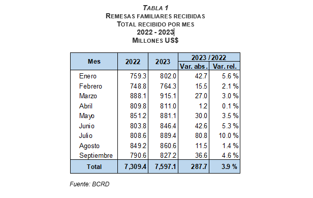 El Banco Central de República Dominicana (BCRD) informó este jueves que en el período enero-septiembre las remesas recibidas alcanzaron la cifra de US$7,597.1 millones, lo cual representa un crecimiento de 3.9% en comparación con el mismo período del año anterior.