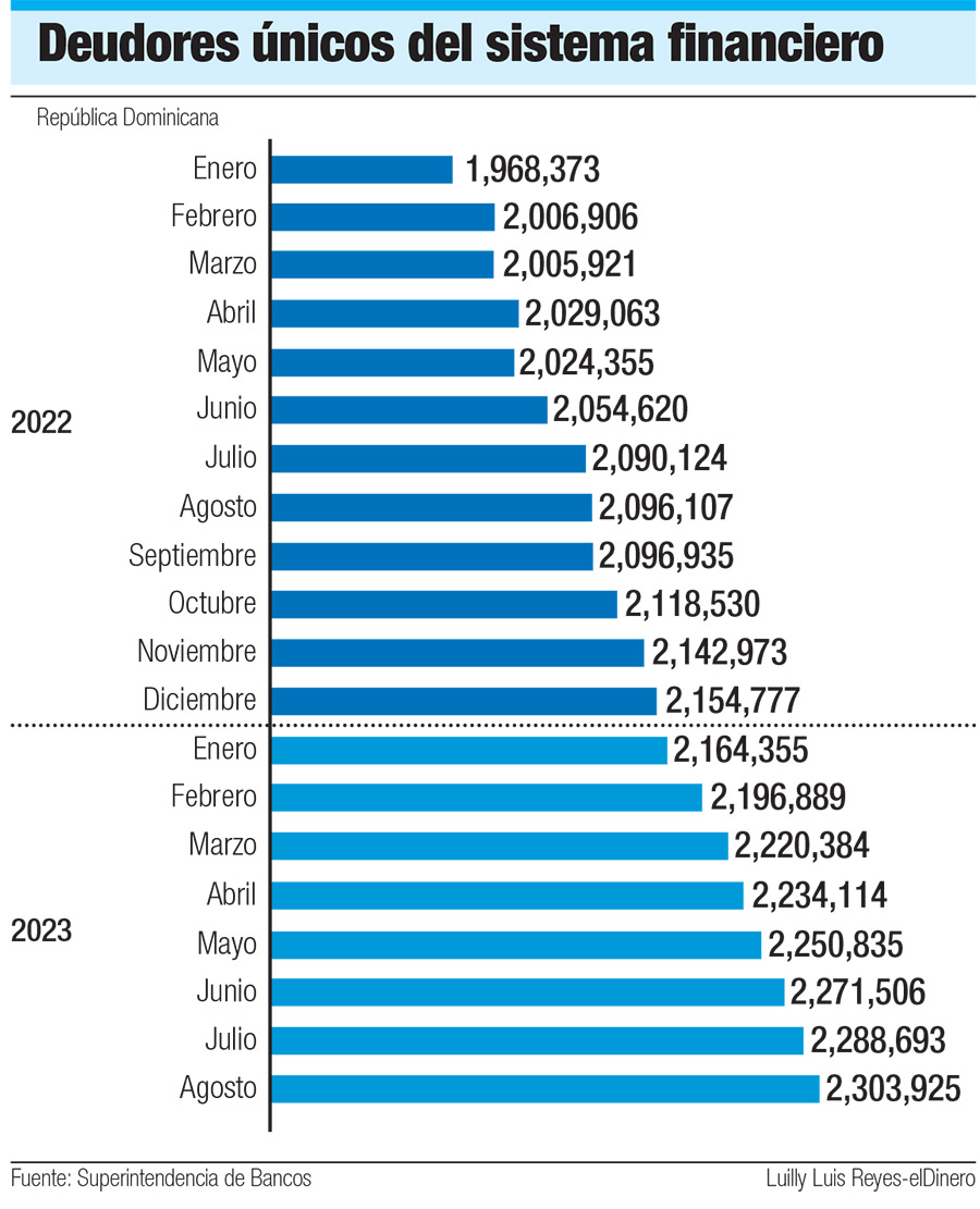 Eso podría significar problemas. Los deudores únicos pasaron de 1,968,373 en enero del año pasado, a 2,303,925 en agosto de 2023. Los prestamos pasaron de 4,563,904 a 6,206,311 en el mismo período, según datos del Banco Central (BCRD). Asimismo, el saldo adeudado aumentó en un 27.89%.