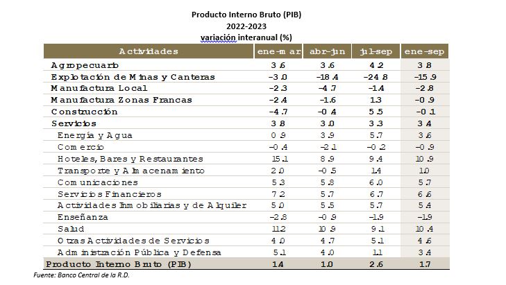 Al analizar la composición de la variación del PIB por actividad, observa que la “Construcción”, sector de gran efecto multiplicador en el resto de la economía y que ha recibido recursos de las facilidades monetarias al mes de septiembre por RD$12,300 millones y de aproximadamente RD$11,000 millones en octubre por las nuevas medidas mencionadas, pasó de registrar variaciones en su valor agregado real de -4.7% en el primer trimestre y de -0.4% en el segundo trimestre (en gran medida por la moderación de la demanda interna y los elevados costos de los principales insumos) a un incremento interanual de 5.5% en julio-septiembre de 2023.