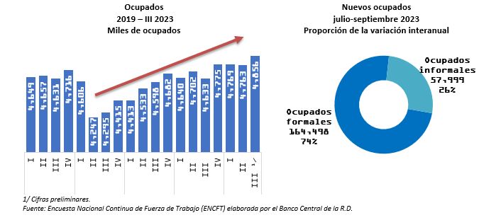 De igual forma, el mejor desempeño registrado por la economía dominicana en el trimestre julio-septiembre por las facilidades otorgadas para la reactivación de los sectores productivos, se ha visto reflejado en la creación de empleos. En ese sentido, de acuerdo con los datos de la Encuesta Nacional Continua de Fuerza de Trabajo (ENCFT) del Banco Central al tercer trimestre de 2023, la ocupación ascendió a 4,855,631 trabajadores, un nivel histórico que representa 222,497 ocupados netos adicionales en doce meses, equivalente a una tasa de crecimiento de 4.8%. Un aspecto importante a destacar del mercado laboral es que esta generación de nuevos puestos de trabajo estuvo concentrada en la ocupación formal, es decir, aquellos que tienen acceso a los beneficios de seguridad social vía su ocupación, verificándose un incremento de 164,498 personas en dicha categoría, representando un 74 % del referido aumento en los ocupados.