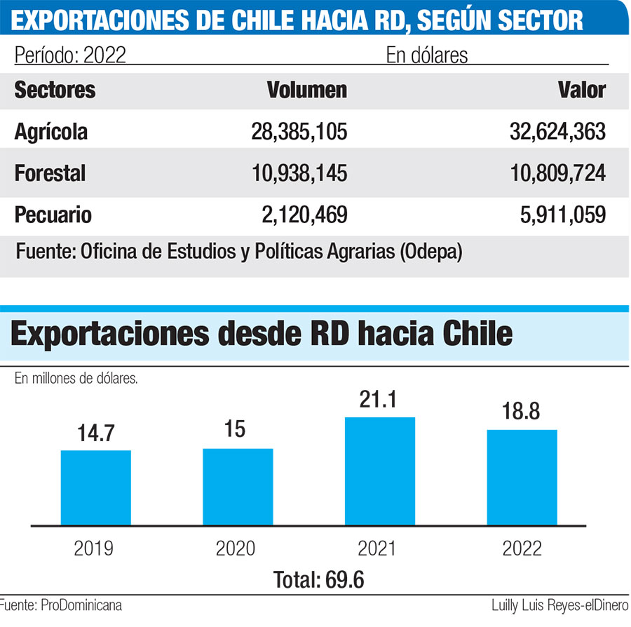 Frutas, ron y tabaco son algunos de los productos que participan en la balanza comercial de República Dominicana con Chile, según destaca el embajador. Las estadísticas oficiales del Centro de Exportación e Inversión de la República Dominicana (ProDominicana) apuntan que en 2022 las ventas externas hacia Chile alcanzaron los US$18,764,881.7.