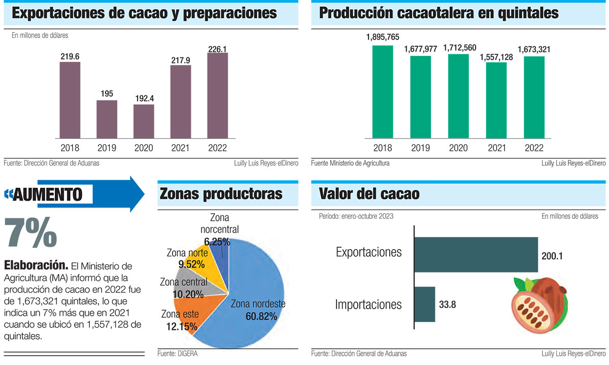 La producción de cacao en 2022 fue de 1,673,321 quintales, lo que indica un 7% más que en 2021 cuando se ubicó en 1,557,128 de quintales.