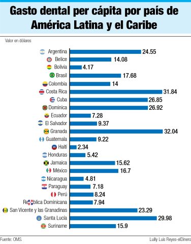 Citando datos de la OMS, el gasto per cápita en salud dental del país es de US$7.94, con un gasto total de US$82.32 millones en 2019. A pesar de esto, en esta media isla hay escasez de dentistas, especialmente en zonas fronterizas.