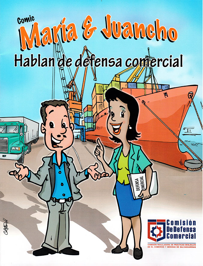 La guía ilustrada, en forma de comics, consiste en un diálogo sobre defensa comercial que sostienen dos personajes, María y Juancho, explicando todo lo relacionado con prácticas desleales en el comercio, dumping, subvenciones y medidas de salvaguardia.