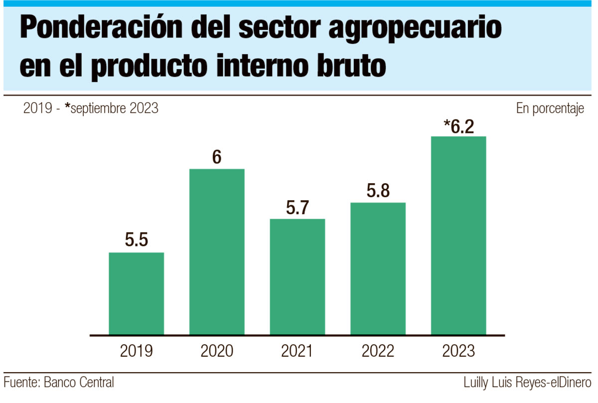 De acuerdo con el Banco Central de la República Dominicana (BCRD), la ponderación o participación del sector agropecuario dentro del producto interno bruto (PIB) se ha mantenido estable durante los últimos cinco años, aunque con pequeñas fluctuaciones. Desde 2019 a septiembre de 2023 las aportaciones del sector agropecuario al PIB han sido en promedio de 5.8%. En cuanto al crecimiento, la actividad registró de enero a septiembre del año pasado un decrecimiento de 0.5 puntos porcentuales al comparar con el mismo período de 2022.