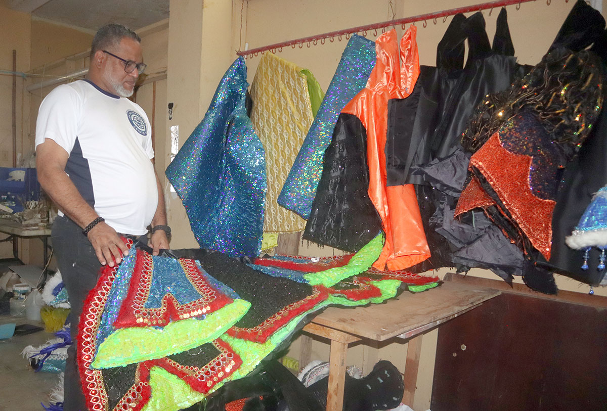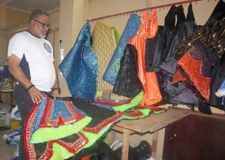 Sin embargo, con la integración de nuevos elementos como las telas de brillo, plumas, lentejuelas, marabú, colcha, pana, soutaches, canutillos y otros similares debe trabajar todo el año para que las cinco comparsas con las que trabaja (que constan de 30 a 40 personas) y los trajes individuales estén listos en febrero. “Hemos evolucionado de usar satín a incorporar nuevas telas y elementos”, explica.