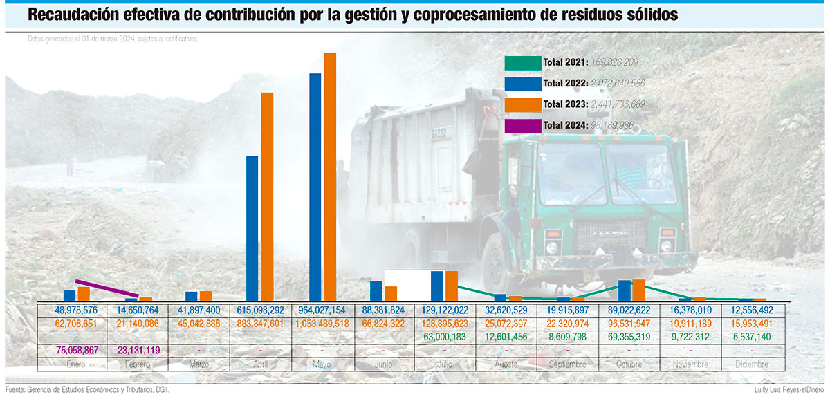 En los dos primeros meses de 2024 fueron RD$98.2 millones. Desde su implementación, la Ley 225-20 ha generado RD$4,782.4 millones, los cuales se manejan a través del Fideicomiso Público-Privado de Gestión Integral de Residuos, que en la primera etapa a ejecutarse en el período 2022-2023, según el Poder Ejecutivo al monto de lanzar la iniciativa en diciembre de 2021, tendría un costo de RD$13,290 millones. La DGII debe transferir a la Tesorería Nacional los recursos recaudados mediante esta ley dentro de los 30 días siguientes a su recepción.