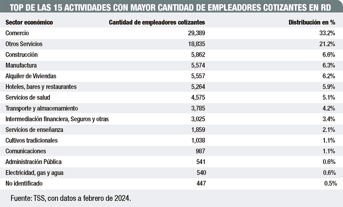 En febrero de 2024, el sector de servicios agrupa la mayor cantidad de trabajadores cotizantes (1,816,569) por actividad económica, representando el 81.86% del total. No obstante, no es que figure con el salario más alto, sino que ocupa la posición seis al tener un salario promedio de RD$35,172.2.