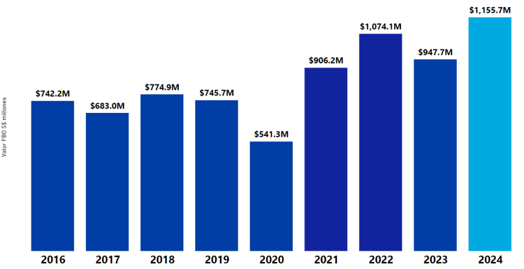 La directora ejecutiva del Centro de Exportación e Inversión de la República Dominicana (ProDominicana), Biviana Riveiro, informó que las exportaciones dominicanas alcanzaron US$1,155.7 millones en abril de 2024, equivalente a un crecimiento interanual de 22% y una variación absoluta de US$208.1 millones con respecto al mismo mes del 2023.