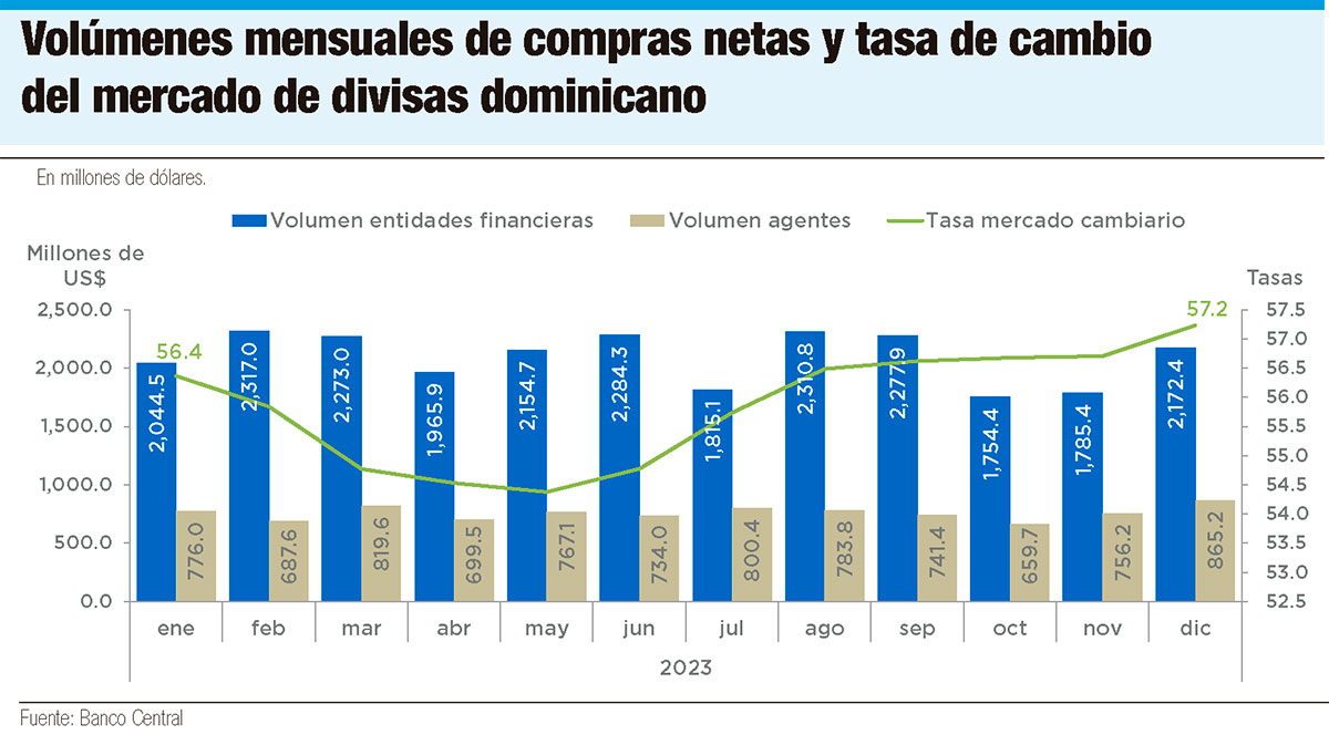 En 2022 y 2023, en términos consolidados, el mercado cambiario dominicano reportó compras netas por US$67,155.5 millones para la compra y otros US$66,262.9 millones para la venta. El crecimiento ha sido constante, acorde a la expansión del producto interno bruto (PIB).