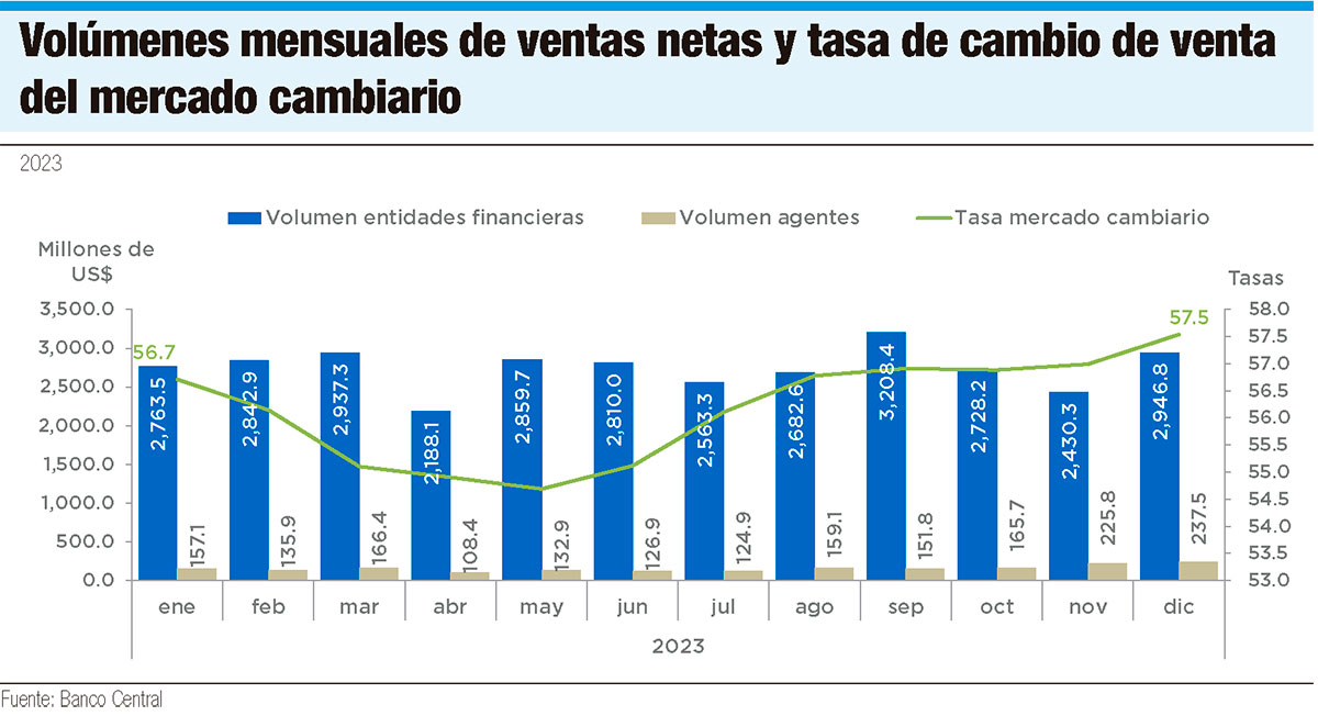 En en año 2023 el mercado de divisas formal transó US$34,853.5 millones para la venta, un 11% más que en 2022, lo que equivale a un promedio mensual de US$2,904.5 millones. Para la compra el monto fue de US$34,245.8 millones, es decir, US$2,853.8 millones por mes.