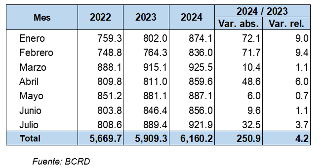 Particularmente, en el mes de julio se recibieron US$921.9 millones por este concepto, un incremento de 3.7% respecto a julio de 2023.