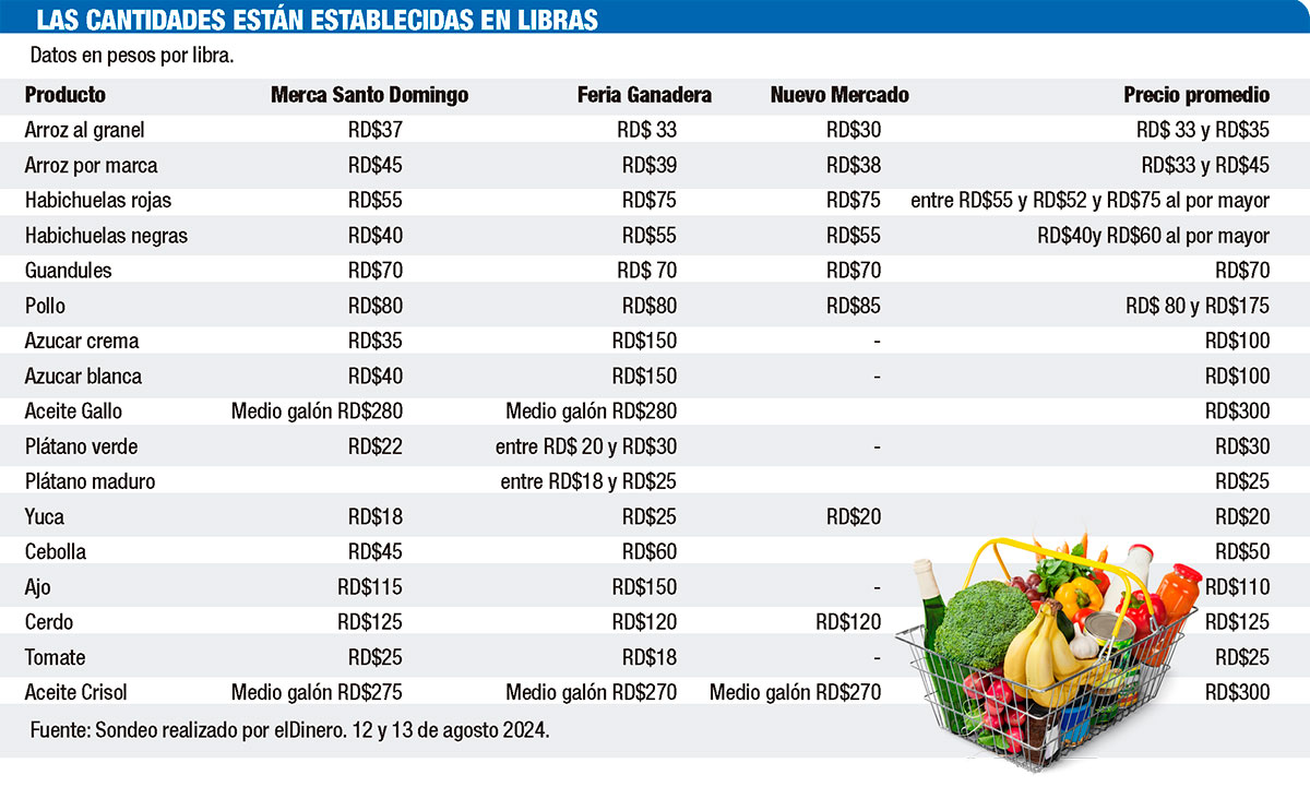 En un levantamiento realizado por elDinero sobre tres centros de abasto de alimentos: Merca Santo Domingo, la Feria Ganadera y el Mercado Nuevo de la Duarte, se observó que los productos básicos como las habichuelas, el arroz, la carne de cerdo y el pollo han mostrado variaciones en sus precios.