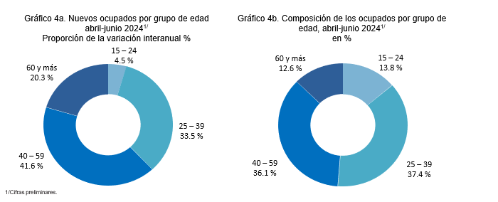 Asimismo, analizando la distribución por grupo de edad (gráfico 4a), se observa que durante los últimos doce meses la generación de nuevos ocupados netos se concentró en los adultos con edades comprendidas entre 40-59 años, representando el 41.6% (99,526) de los 238,972 nuevos puestos de trabajo, seguidos por la población de 25-39 años (80,129), 60 y más (48,465), y los jóvenes de 15-24 años con 10,852 empleos adicionales.
