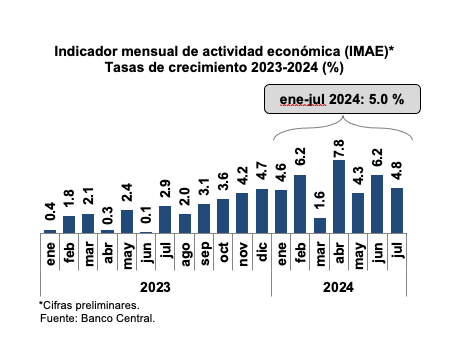 El Banco Central de la República Dominicana (BCRD) informó que el indicador mensual de actividad económica (IMAE) registró una expansión de 4.8% durante el mes de julio del 2024, acumulándose un crecimiento promedio interanual de 5.0% en los primeros siete meses del año.