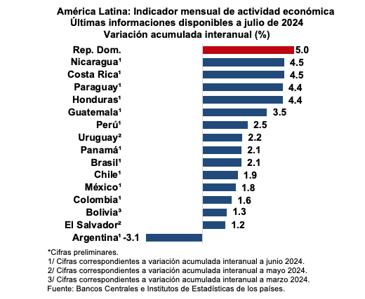 El BCRD dijo que, la expansión del IMAE en enero-julio coloca a la República Dominicana como la economía de mayor incremento interanual respecto a sus pares de Latinoamérica, conforme la última información disponible a la fecha publicada por los países. Asimismo, este resultado se encuentra en línea con los pronósticos de los diferentes organismos internacionales, los cuales ubican al país como líder en términos de crecimiento de la actividad económica en la región para el cierre de 2024. En efecto, las últimas proyecciones del Fondo Monetario Internacional (FMI) estiman el crecimiento del PIB del país para este año en 5.1%, las del Banco Mundial en 5.1% y las de la Comisión Económica para América Latina (Cepal) en 5.2%.