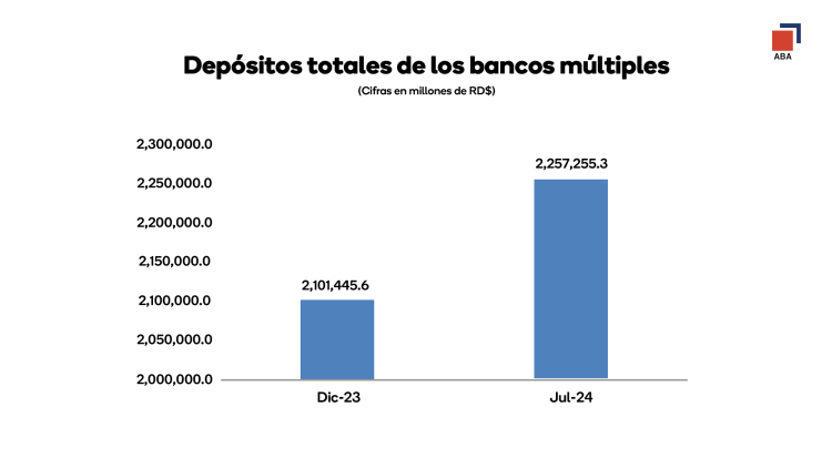 Los depósitos totales del público en el sector bancario totalizaron RD$2 billones 257,253 millones a julio de 2024, monto que incluyó un incremento de RD$155,800 millones en términos absolutos, equivalente a un 7.41%, informó la Asociación de Bancos Múltiples de la República Dominicana (ABA).