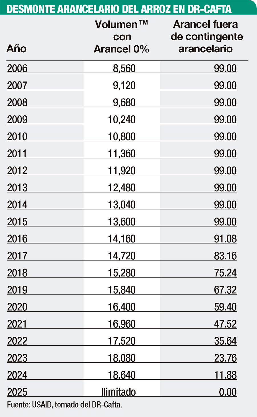 Ese volumen ha ido aumentando año tras año. Para el año 2024, el volumen permitido bajo ese esquema alcanza 18,640 toneladas métricas y el arancel para cualquier cantidad que lo supere está en 11.88%. A partir de 2025, el volumen será ilimitado, lo que significa que cualquier cantidad de arroz importado estará libre de arancel.
