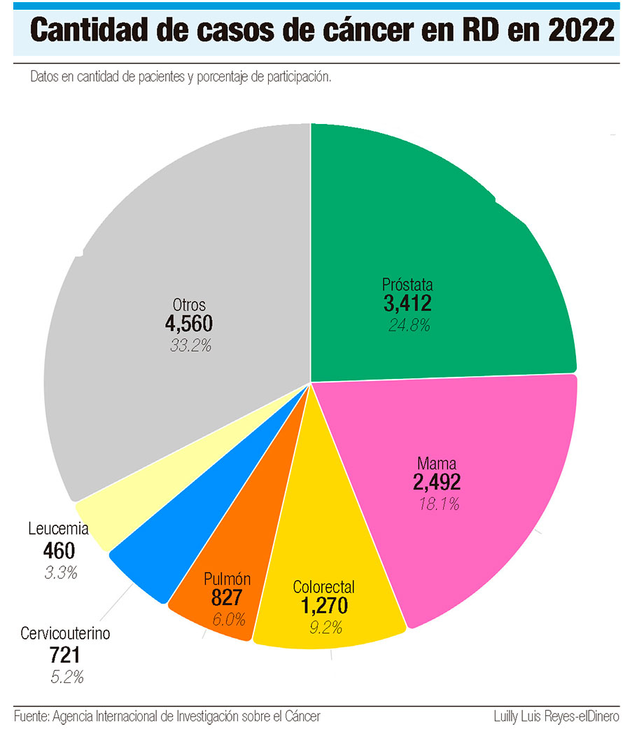 Según la Agencia Internacional de Investigación sobre el Cáncer, en 2022 se registraron 13,742 casos de cánceres en República Dominicana, donde el 24.8% de estos fueron de próstata con 3,412 registros y encabezando la lista, seguido de 2,492 diagnósticos de cáncer de mama representando un 18.1%, el cáncer colorrectal tuvo un 9.2% con 1270 pacientes.