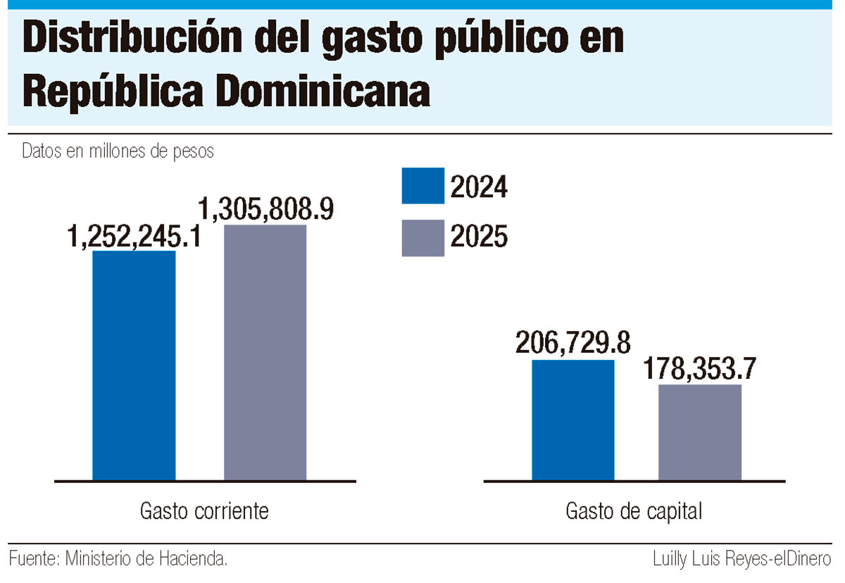 De acuerdo con el presupuesto reformulado de este año, el total de gastos del Gobierno Central será de RD$1 billón 458,974.8 millones, de esa cantidad, el 85.9% sería para gasto corriente, con una partida de RD$1 billón,252,245.1 millones, mientras que el gasto de capital cerraría en 14.1% con RD$206,729.8 millones.
