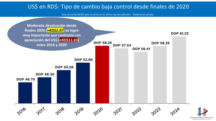 Los sectores generadores de divisas explican gran parte del crecimiento y de la estabilidad económica, por lo que este fuerte crecimiento interanual (+8.1%) es una excelente noticia para la economía dominicana. De hecho, el creciente flujo de divisas hacia la República Dominicana ha permitido frenar significativamente la acostumbrada devaluación del RD$ vs. US$, como se muestra en la gráfica anexada. Durante el período 2016-2020, el dólar subió de RD$46.70 a RD$58.35, o sea una apreciación del US$ por RD$11.65 equivalente a +24.9%; sin embargo, entre 2020 y 2024, la apreciación nominal del US$ fue prácticamente 4 veces menor a la del cuatrienio anterior, al pasar de RD$58.35 a RD$61.32, o sea una apreciación del US$ por RD$2.97 equivalente a tan solo +5.1%. Para entender mejor el impacto tan favorable de esta reducción en la apreciación del US$: de haberse mantenido el ritmo porcentual del cuatrienio anterior, el valor del US$ hubiese cerrado el año 2024 en RD$72.90, o sea RD$11.58 por encima del cierre real del año 2024, lo que hubiese tenido un impacto terrible sobre los precios de los principales bienes y servicios, y hubiese reducido el ritmo de crecimiento del producto interno bruto (PIB).