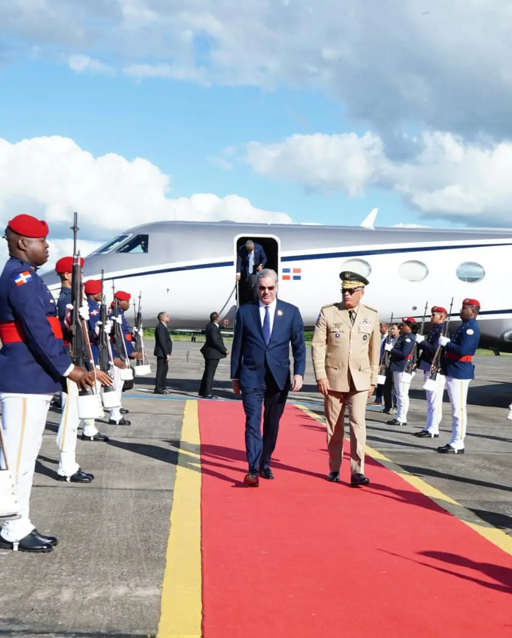 El mandatario viajó acompañado por el canciller Roberto Álvarez; el vicecanciller de Asuntos Consulares y Migratorios, Opinio Díaz Vargas; los directores de la Dirección General de Impuestos Internos (DGII), Luis Valdez; del Despacho Presidencial, Noelia Shephard y el jeje del Cuerpo de Seguridad Presidencial (CUSEP), mayor general, Jimmy Arias Grullón.