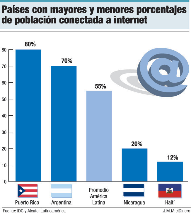 En cambio, los países menos conectados a internet son Nicaragua con el 20% y Haití con únicamente el 12%.