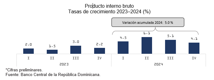 El producto interno bruto (PIB) real registró un crecimiento de 5.0% en 2024 con respecto al año 2023, en línea con las proyecciones oficiales del Banco Central y el Gobierno, así como de los organismos internacionales y analistas privados locales y extranjeros del desempeño promedio para el recién transcurrido año que se ubicaría en torno al ritmo potencial.