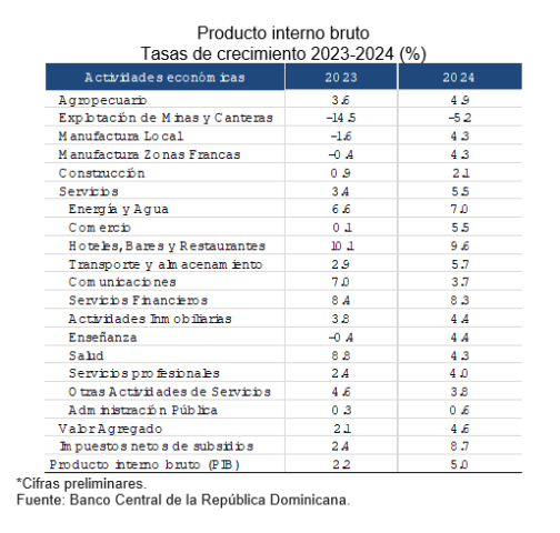 El Banco Central dominicano informó que la economía medida por el producto interno bruto (PIB) registró un crecimiento de 5% en 2024, en línea con las proyecciones que había hecho la instrucción y el Gobierno Central.