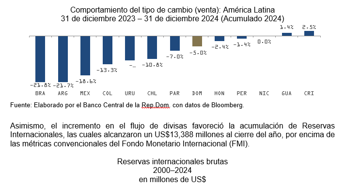 De manera preliminar, se estima que los ingresos de divisas alcanzaron unos US$43,500 millones en el año 2024 y la depreciación del peso dominicano fue de 5.0%, inferior a la observada en las principales economías de la región.