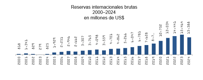 Las reservas internacionales alcanzaron unos US$13,388 millones al cierre del año 2024, por encima de las métricas convencionales del Fondo Monetario Internacional (FMI).