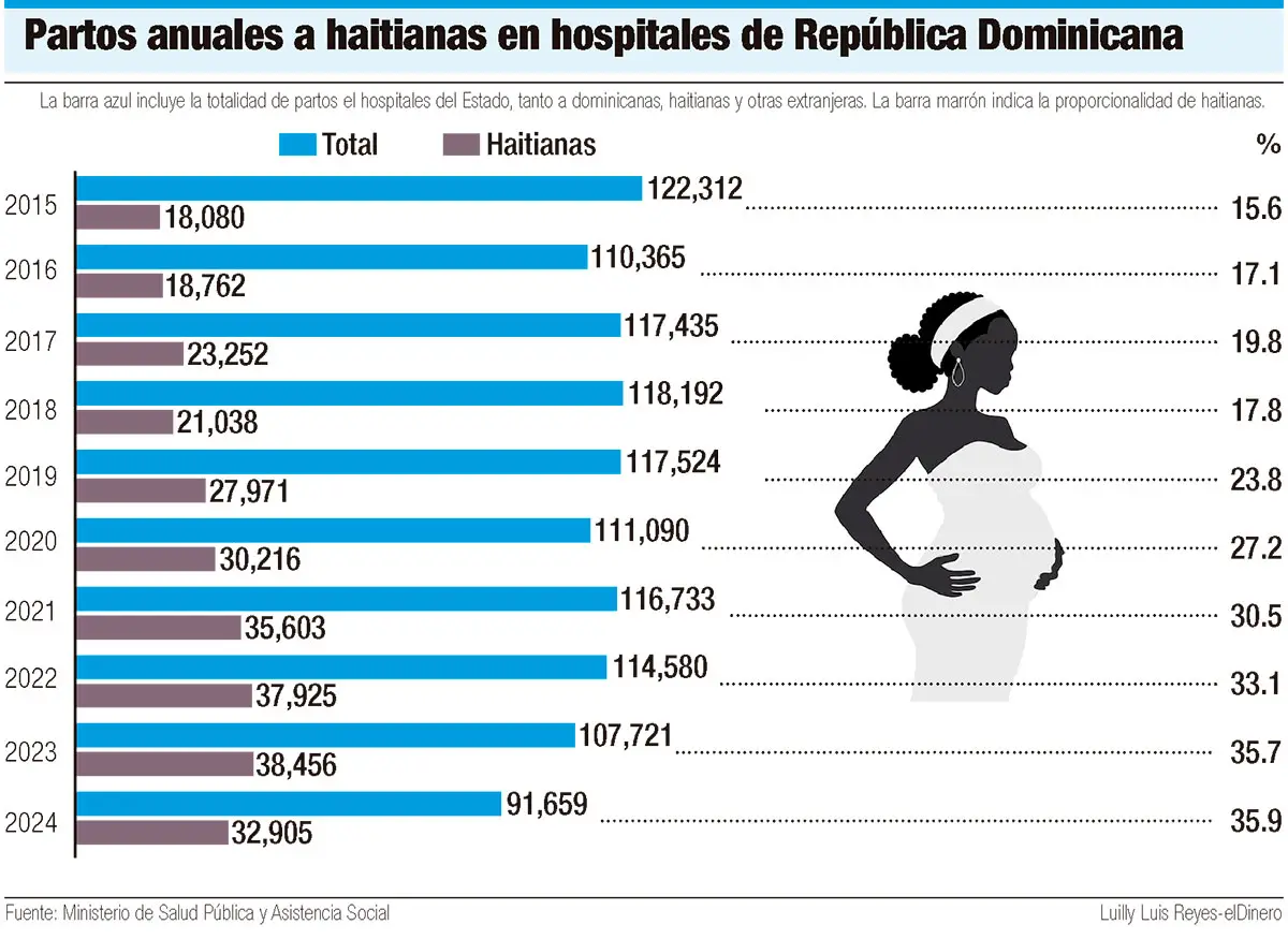 De acuerdo con las estadísticas oficiales, el año pasado las haitianas que dieron a luz en hospitales públicos locales sumaron 32,905, mientras que en 2023 lo habían hecho 38,456, para una reducción de 5,551 (esto es -14.4%).