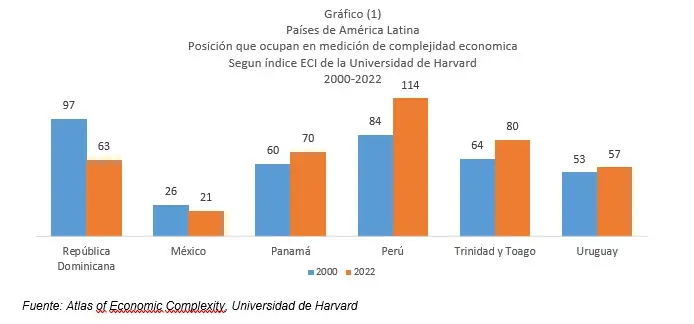 Dichos avances pueden observarse en el índice de complejidad económica de la universidad de Harvard (ECI), indicador que mide la capacidad productiva de unos 145 países tomando en cuenta su diversidad y ubicuidad. Según este índice, RD mejoró su posición relativa de forma importante, pasando del lugar 97 en el año 2000 al puesto 63 en el año 2022, superando a naciones de la región con grado de inversión como Panamá y Perú (gráfico 1). La diversificación de las exportaciones dominicanas ofrece oportunidades para aprovechar la relocalización de las cadenas de suministros que podría ocurrir en un entorno de tensiones comerciales.