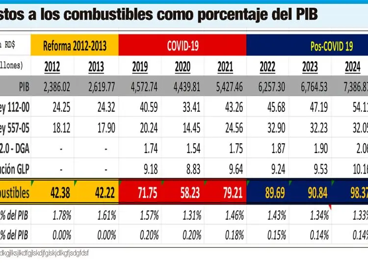 En el caso del Impuesto Específico por la Ley 112-00 (IES), cobrado en pesos dominicanos por galón, y cuyo valor se suponía se iba indexando trimestralmente por inflación, es precisamente el hecho de no haberse indexado desde 2015 lo que ha provocado la baja marcada como % del PIB: la presión tributaria de esta figura habrá bajado desde 1.02% del PIB (2012) a apenas 0.73% del PIB (2024) a pesar de que las recaudaciones de este IES hayan pasado de RD$24,250 millones (2012) a RD$54,110 millones (2024).