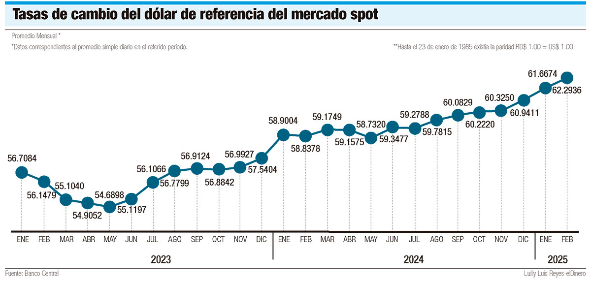 El Banco Central (BCRD) publicó esta semana que la tasa del dólar para la compra es de RD$62.7536, lo que implica una apreciación de la moneda estadounidense de un 3.62% en lo que va de año, al hacer la comparación con el promedio de cierre de RD$60.5631 de diciembre de 2024. A principios de semana hubo transacciones de hasta RD$63.25 en bancos múltiples y asociaciones de ahorros y préstamos.