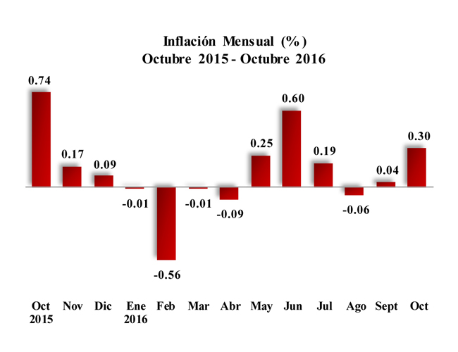 El Banco Central de la República Dominicana (BCRD) informa que la inflación del mes de octubre de 2016, medida por la variación del Índice de Precios al Consumidor (IPC), fue de 0.30% con respecto al mes de septiembre, ubicando la inflación acumulada enero-octubre en 0.65 por ciento.