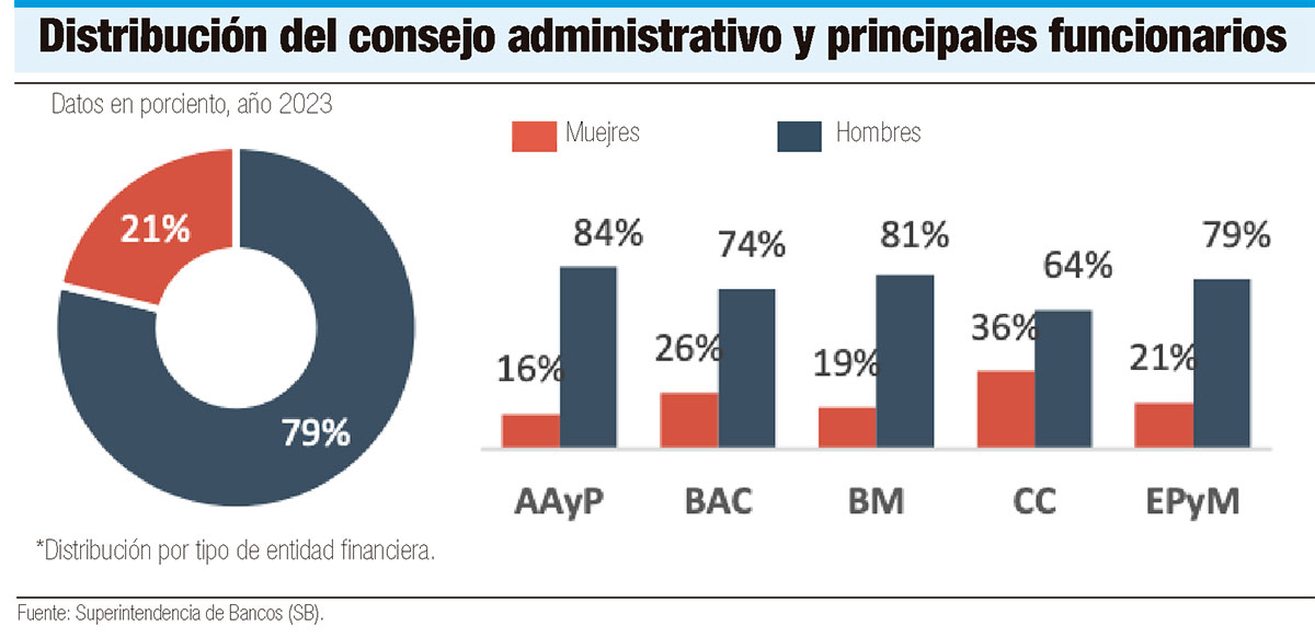 Un informe de la SB de 2023 revela que, aunque las mujeres constituyen el 57% de los empleados y el 53% de los mandos altos en las entidades financieras, sólo ocupan el 21% de los asientos en los consejos administrativos, donde predominan los hombres con un 79%.