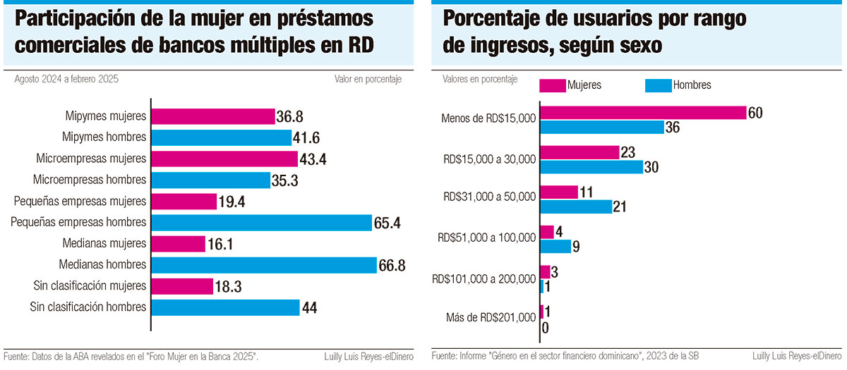 De las mujeres encuestadas por la Superintendencia de Bancos (SB), el 32% tiene educación universitaria, mientras que la proporción de hombres con el mismo nivel educativo es del 23%. Pese a esta característica, se reporta una mayor cantidad de mujeres con bajos ingresos. El 60% de ellas registra ingresos inferiores a los RD$15,000 mensuales, mientras que en el caso de los hombres este porcentaje es de 36%.